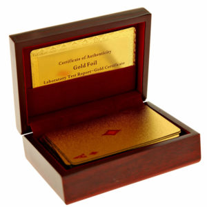 Cărțile sunt fabricate dintr-un material de calitate și pot fi folosite la aproape orice joc de cărți. Acest set conține 54 de cărți compus din 52 obișnuite și doi jokeri. Cărțile au un aspect elegant, vin într-o cutie luxoasă din lemn lăcuit, unde pot fi și păstrate. Set-ul vine și cu un certificat de autenticitate care certifică faptul ca sunt placate cu aur de 24k.